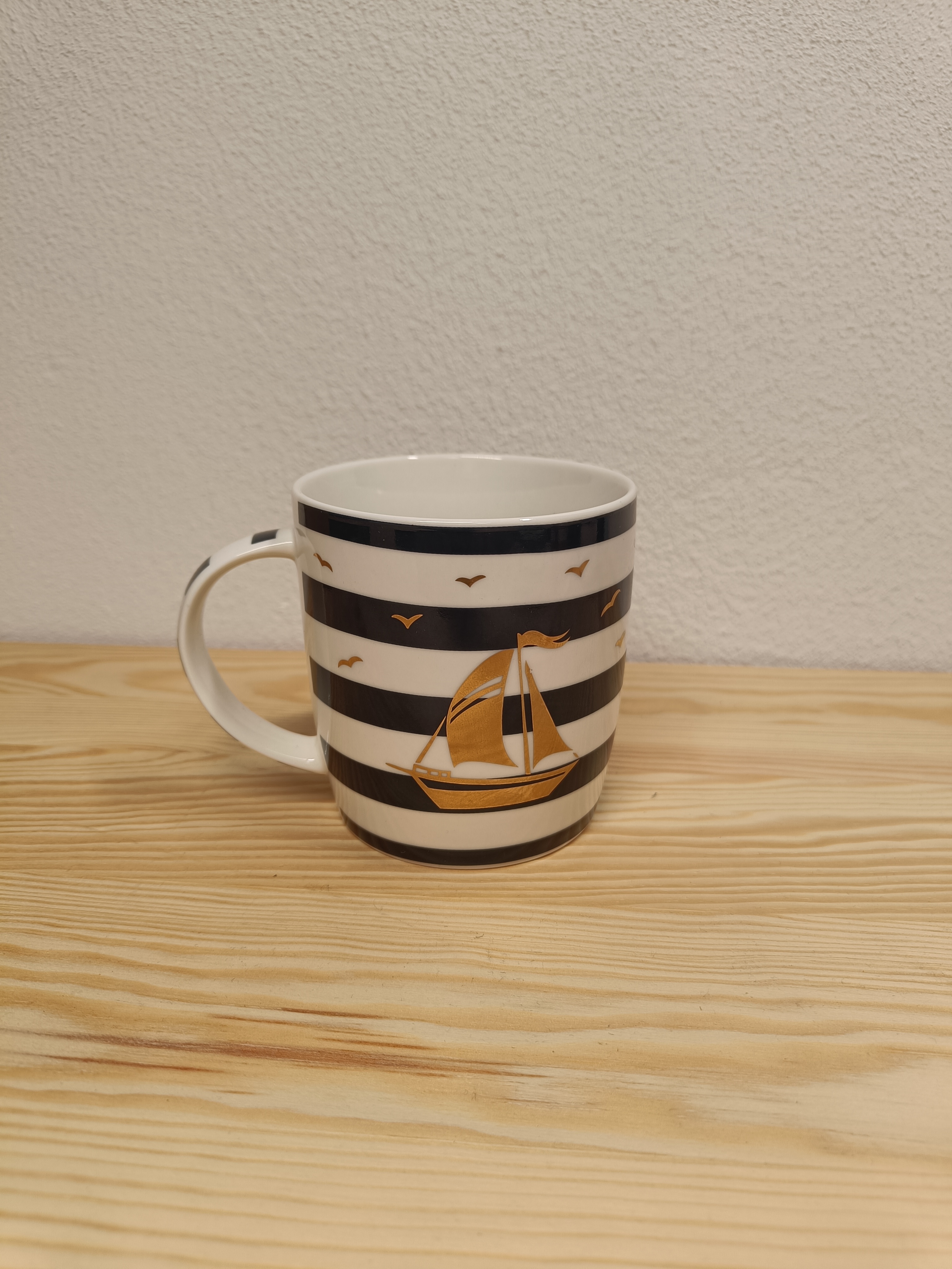 Der elegante Flavia Becher mit goldfarbenem Motiv ist in zwei Versionen erhältlich, mit Anker oder mit Segelschiff als Motiv.