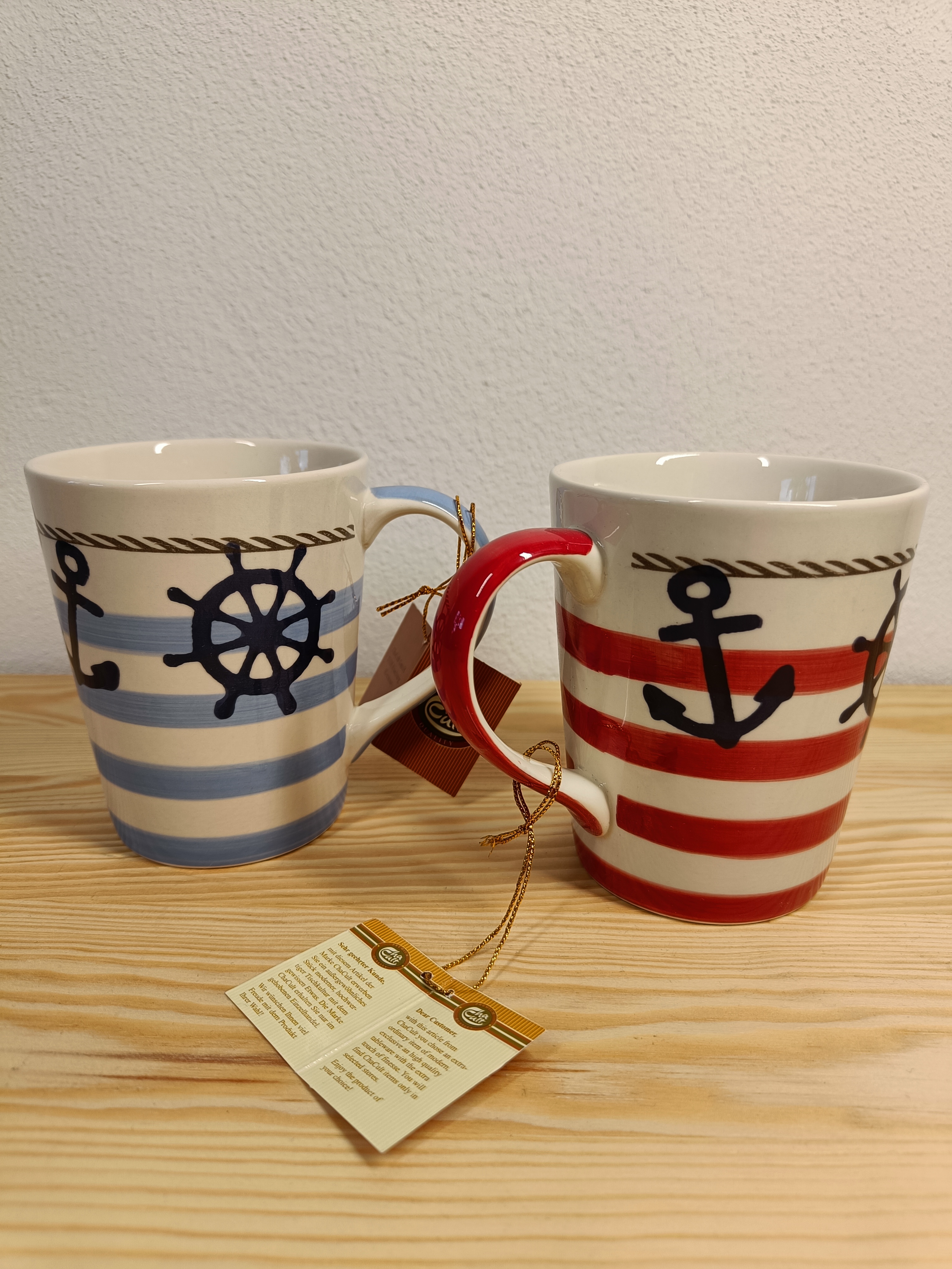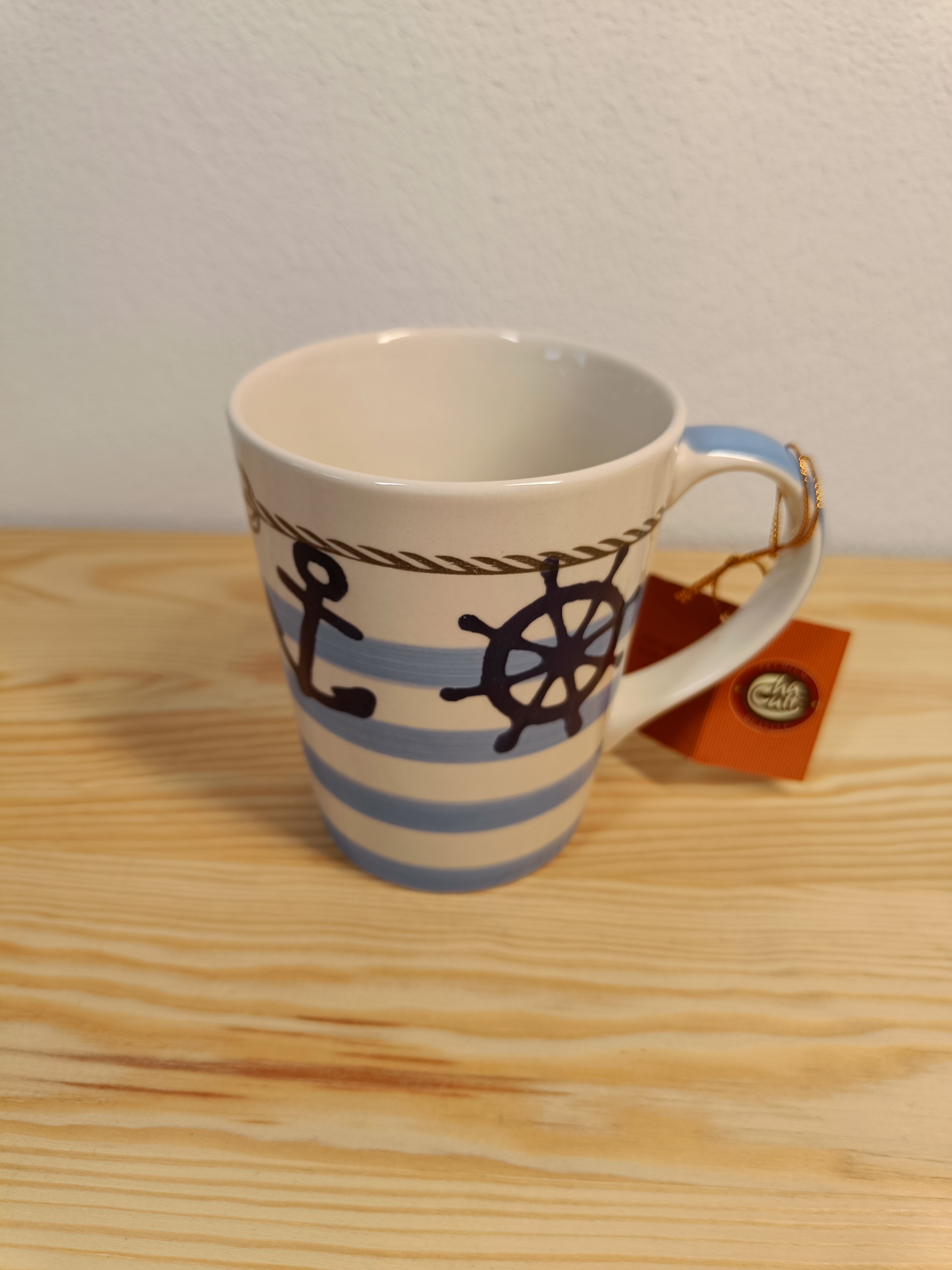 Das maritime Dekor dieses schönen Keramikbechers entführt uns an die nordische Küste. Die klare Farbgestaltung in blau, weiß und rot geht auf die Tradition der marinen Seefahrt zurück. So finden sich diese Farben in Schifffahrtsuniformen und Seezeichen wie Bojen, Leuchttürmen und Feuerschiffen. Dekorelemente wie der Anker und Taue unterstreichen den nautischen Look und erinnern an einen Segeltrip auf hoher See. In diesem Sinne: Mast und Schotbruch, gut Wind und immer eine Handbreit Wasser unterm Kiel!